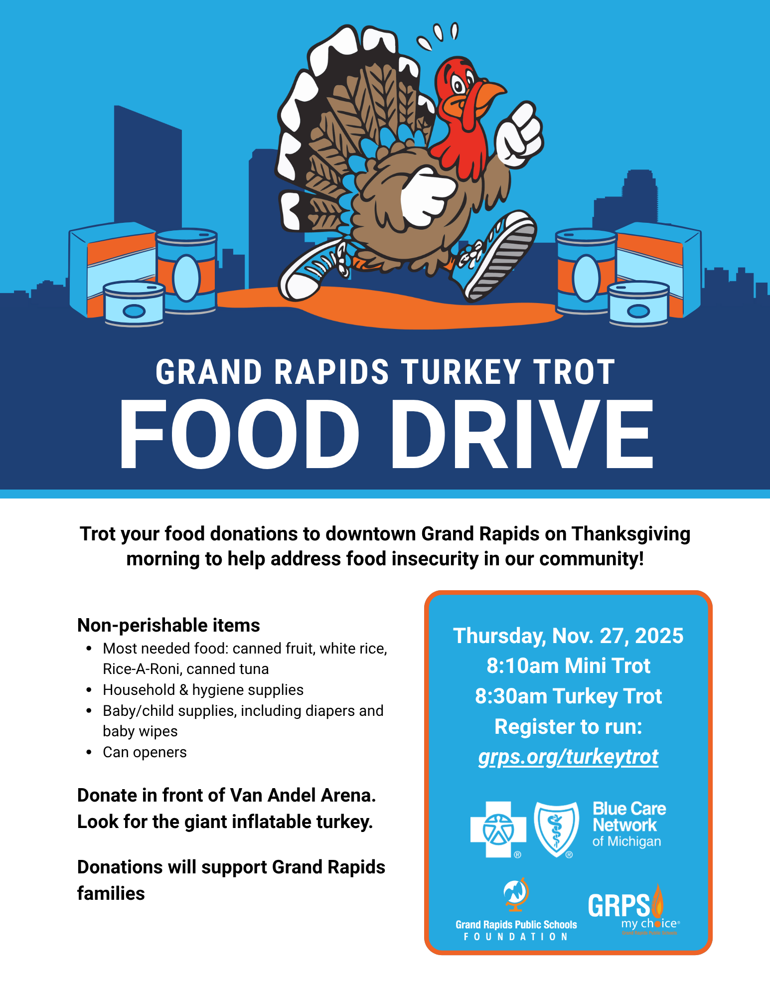 “We’re proud that this year’s Turkey Trot gives runners a chance to give back in an even bigger way,” said Misti Stanton, Board President of the Grand Rapids Public Schools Foundation. “Every food donation helps fuel families right here in Grand Rapids, demonstrating the power of this community to rally around one another.”