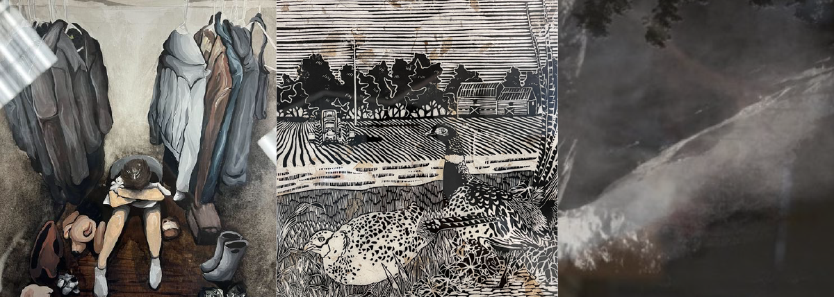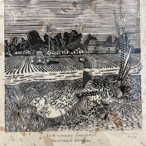 Judges praised Eliot's piece, stating: “This exceptional print demonstrates strong technical ability and mastery of formal elements like line, shape, and pattern. The artist’s precision and varied mark-making create rich texture and depth, while the detailed craftsmanship captures a distinctly rural Michigan landscape and the life it sustains.”
