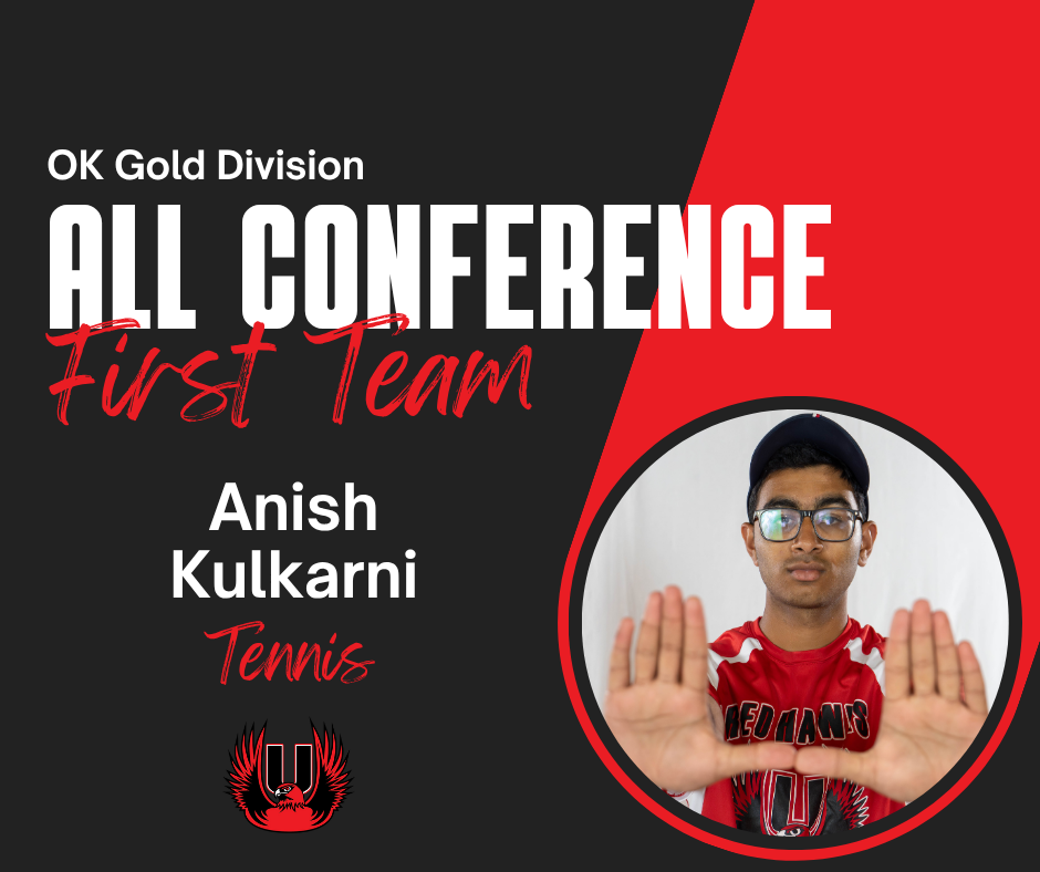 Senior Anish Kulkarni has been named to the OK Gold First Team in tennis for the second year in a row. In addition to his athletic achievements, Kulkarni also consistently earns All State Academic recognition, highlighting his commitment to excellence on the court and in the classroom. During his time with the team, Kulkarni has helped elevate both the academic and athletic standards of the Redhawks tennis program.