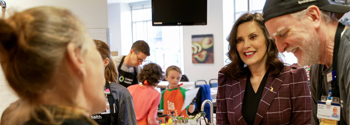 During her visit, Governor Whitmer got a firsthand look at the program in action, observing families as they assembled healthy dishes together in the Downtown Market kitchen.