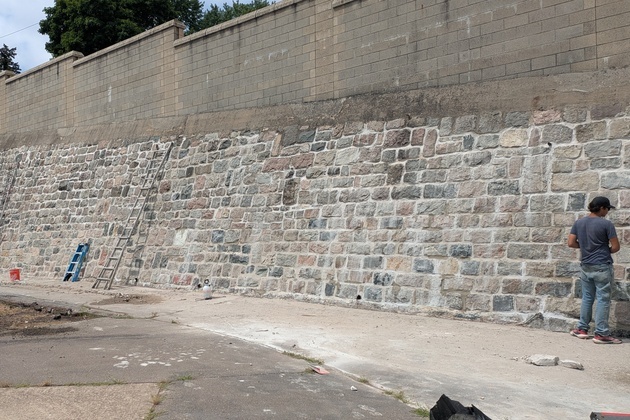 The tuck-pointing work on the historic retaining wall is nearly complete, preserving an important feature of Houseman’s structure while ensuring long-term durability.
