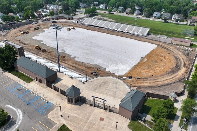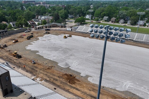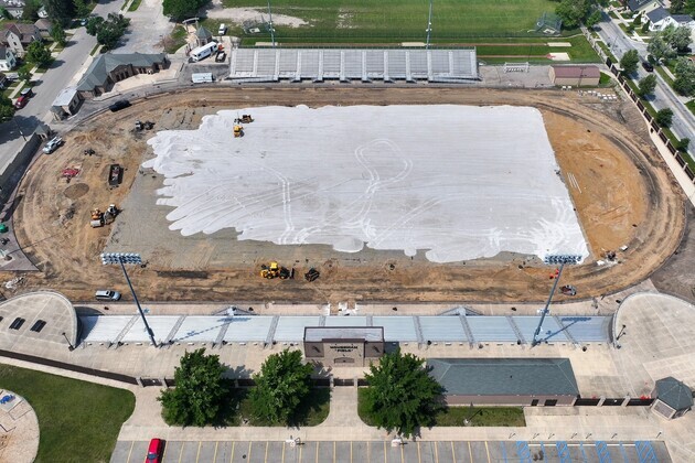 Summer construction is rapidly kicking off at Houseman Field. The old turf and track have been removed. Work is now underway to prepare for the new turf and track to be installed.