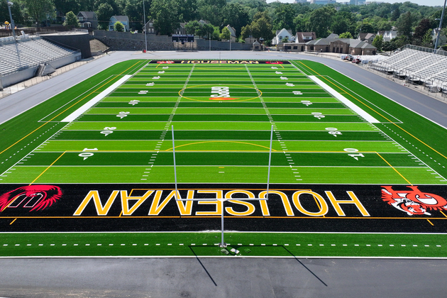 The upgrades include a new playing turf and running track, expanded parking, new field lighting, locker room acoustical improvements, and masonry restoration.