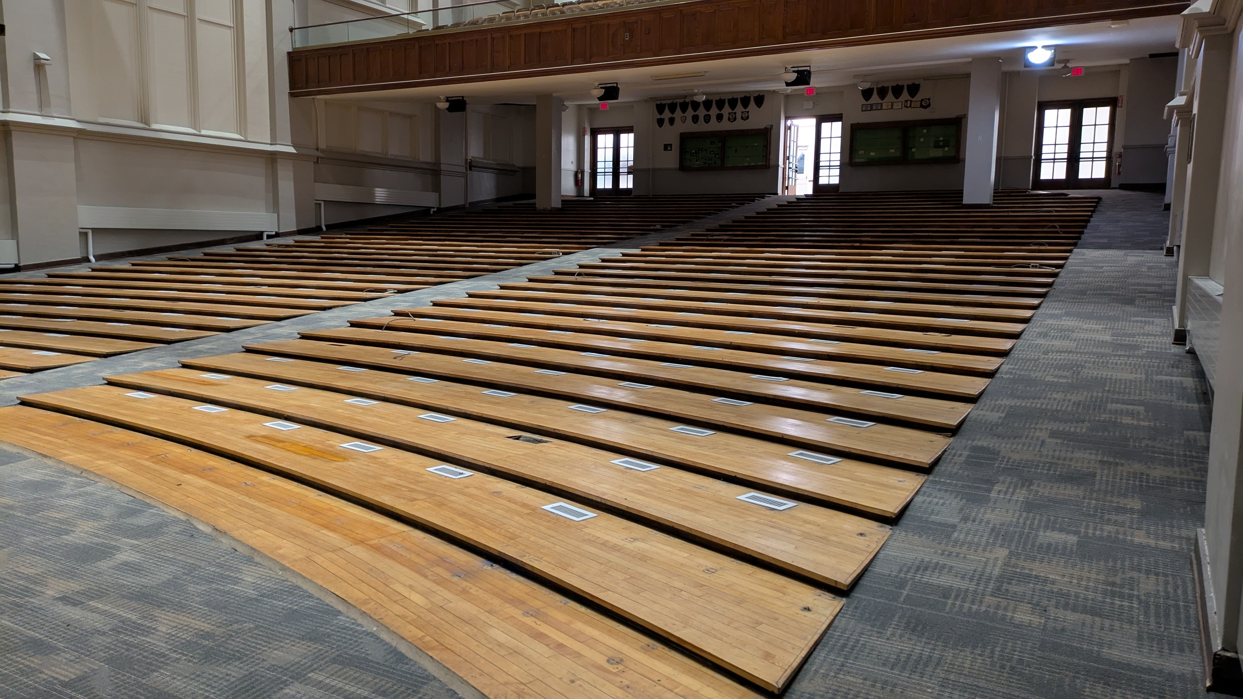 The existing seating has been removed to make way for new construction work, bringing us one step closer to a modernized and more comfortable space for performances. In addition, preparations are underway for brand-new house lighting.